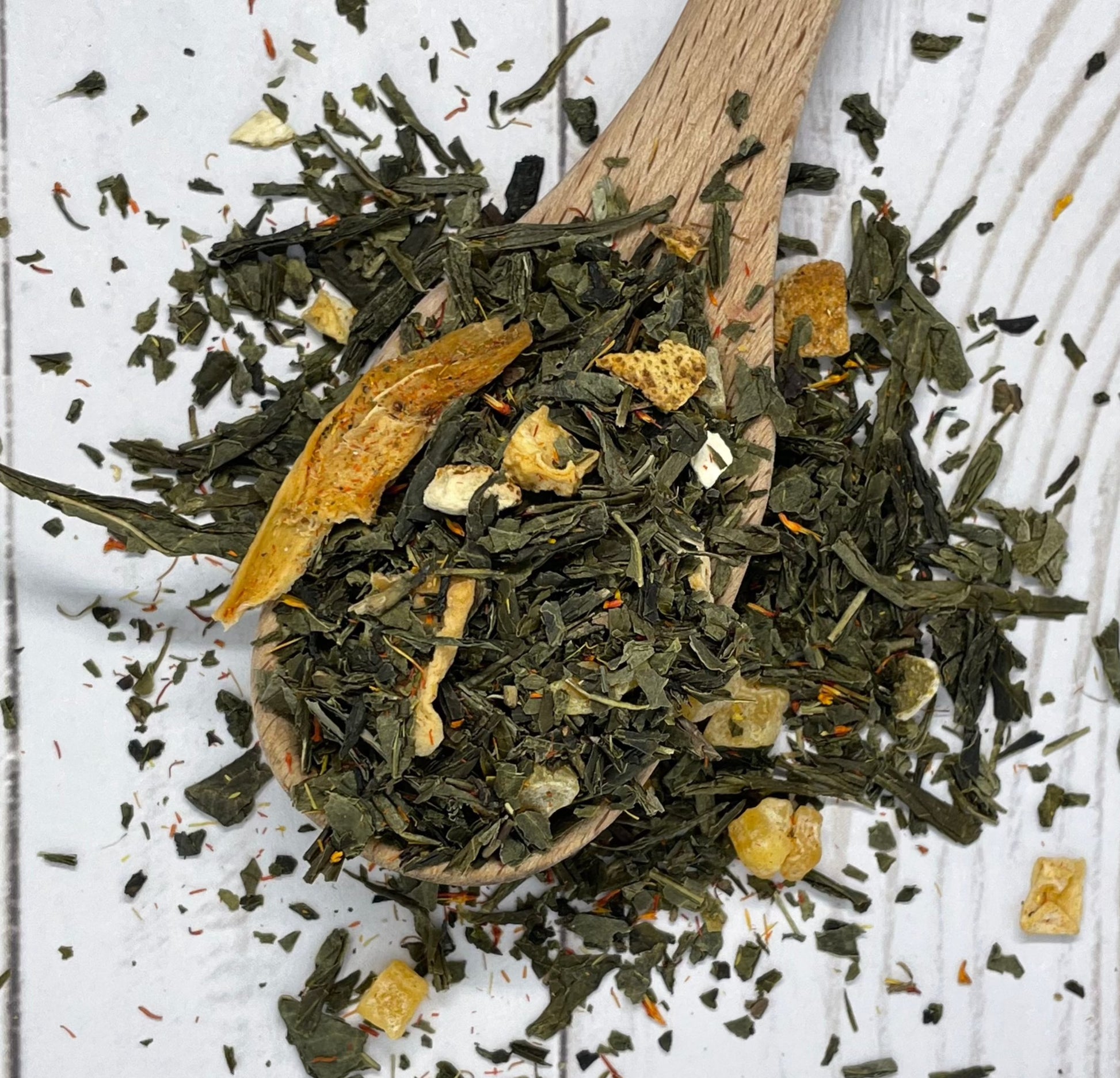 A blend of exotic star fruit, mango, papaya, and orange zest perfectly compliment the delicate Japanese green tea base