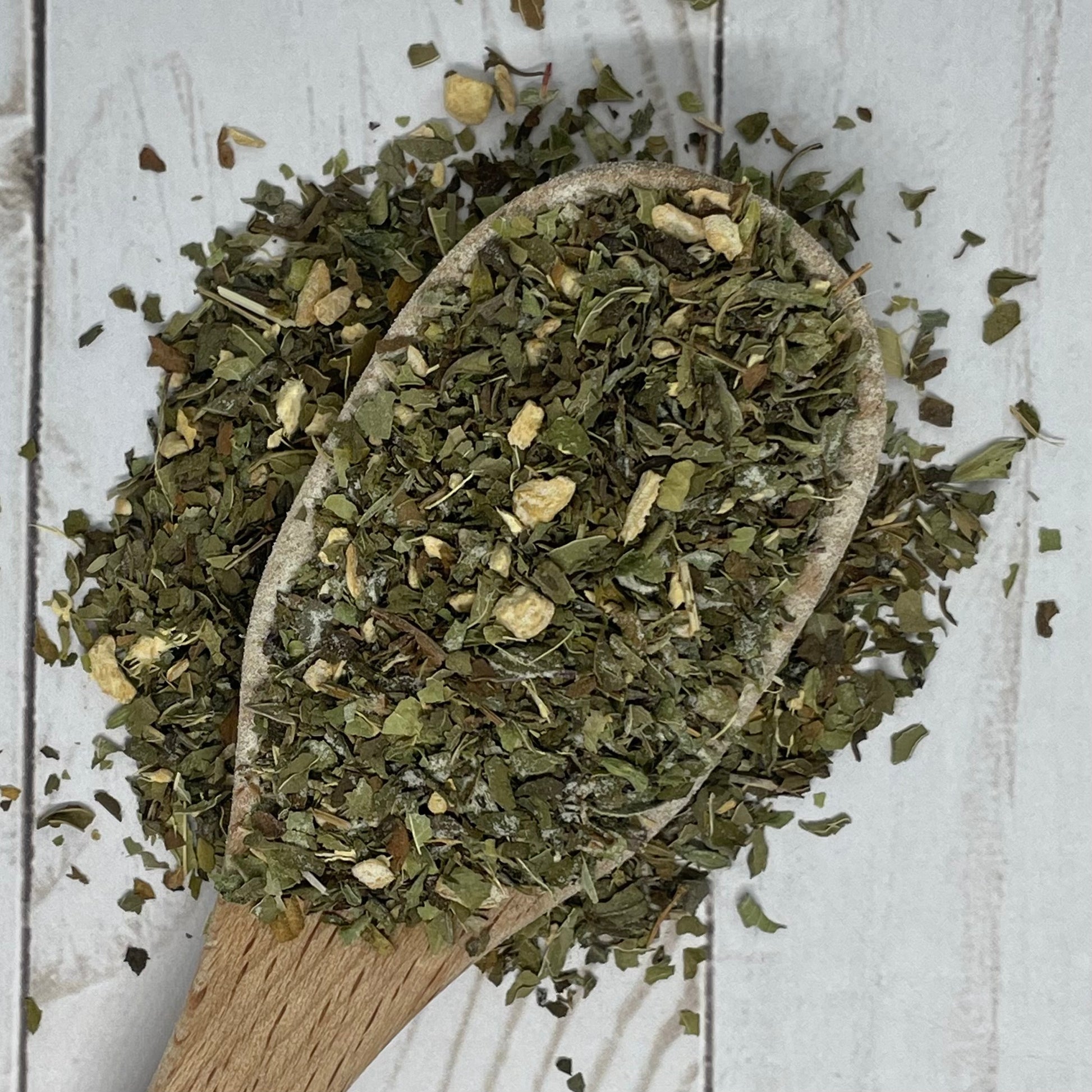 Ingredients: Dry ginger, peppermint, spearmint, lemon balm, lemon verbena, dry lemon powder
