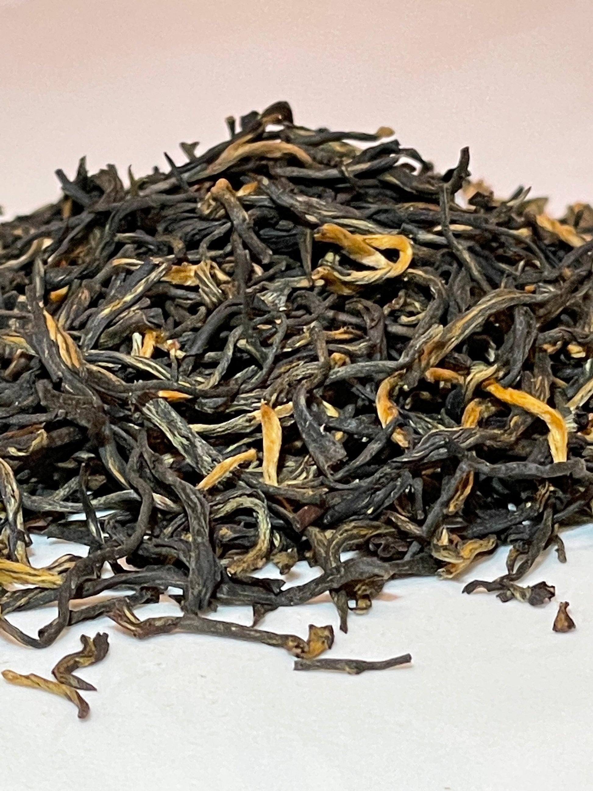 Black tea from the Fujian province of China. Golden Monkey tea is hand-processed each spring with careful plucking of only one leaf and one bud. It brews up Sweet and 'nosy' with hints of cocoa and spice notes that linger. Rich, coating texture and very smooth, soft mouthfeel. Delicate, almost indistinguishable astringency. So So Good!