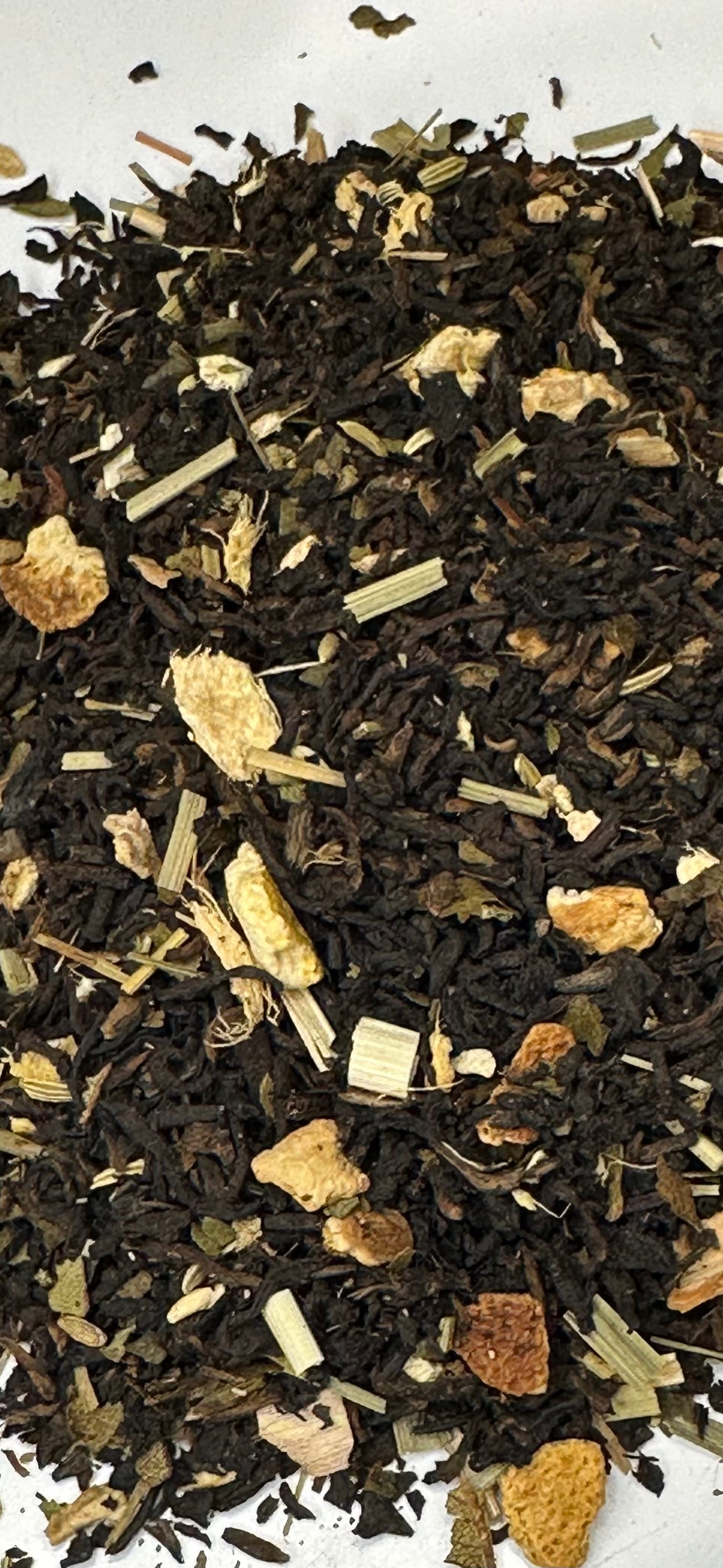 A fermented Black Tea thats brews a deep earthy full body cup with smooth , bright citrus notes with hints of ginger, fennel and lemongrass. Helps to regulate the gut flora