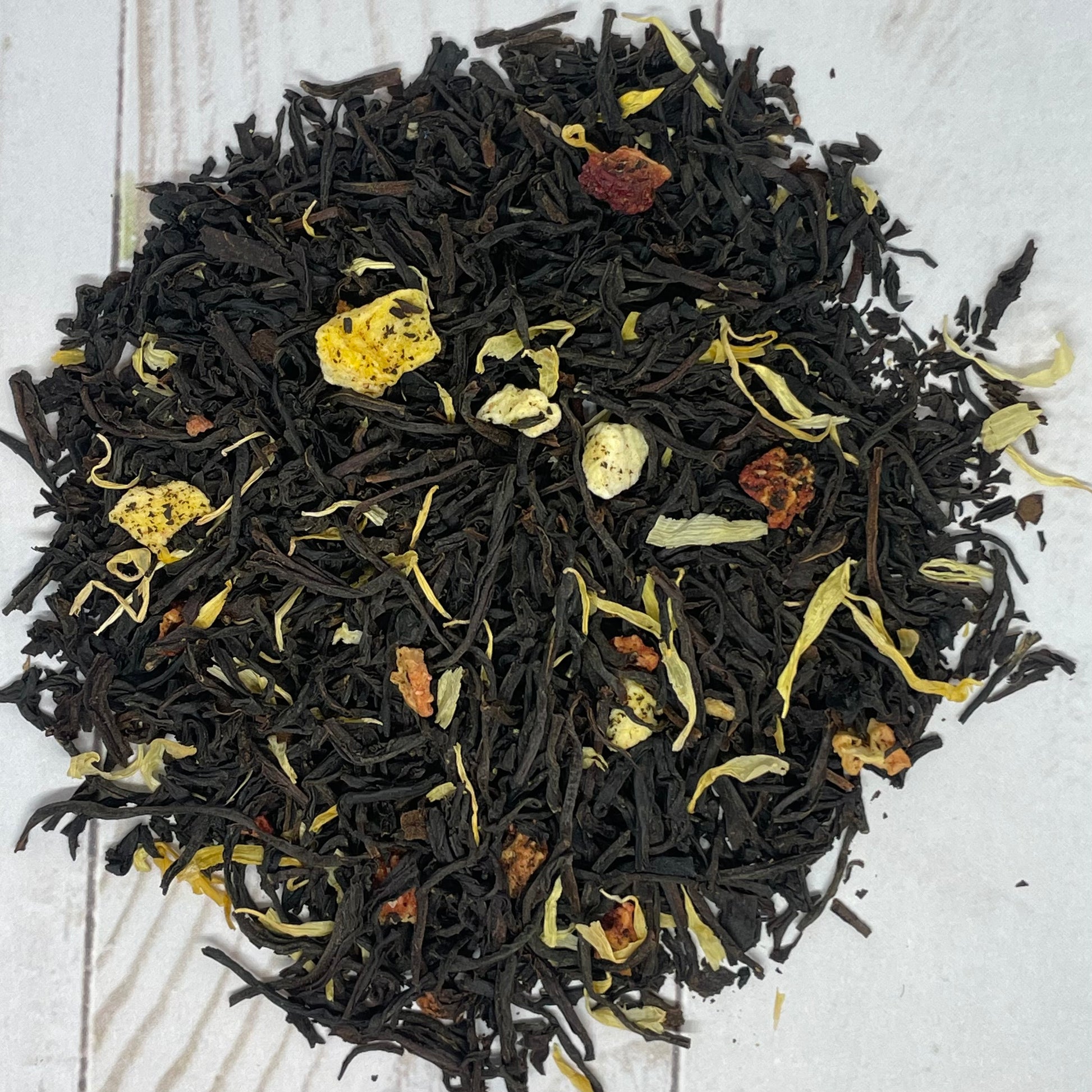 Summery blend of sweet strawberry, juicy mango, bits of marigold, and a Nilgiri black tea create a very refreshing brew.
