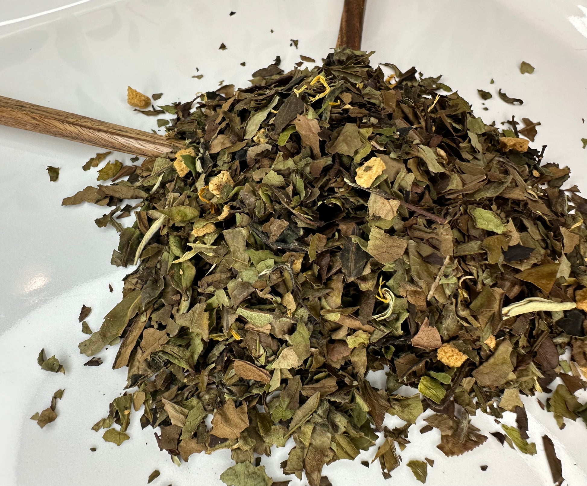 China's Premium white tea from the Fujian region tossed with sweet peaches. A smooth and subtle brew both hot and cold.