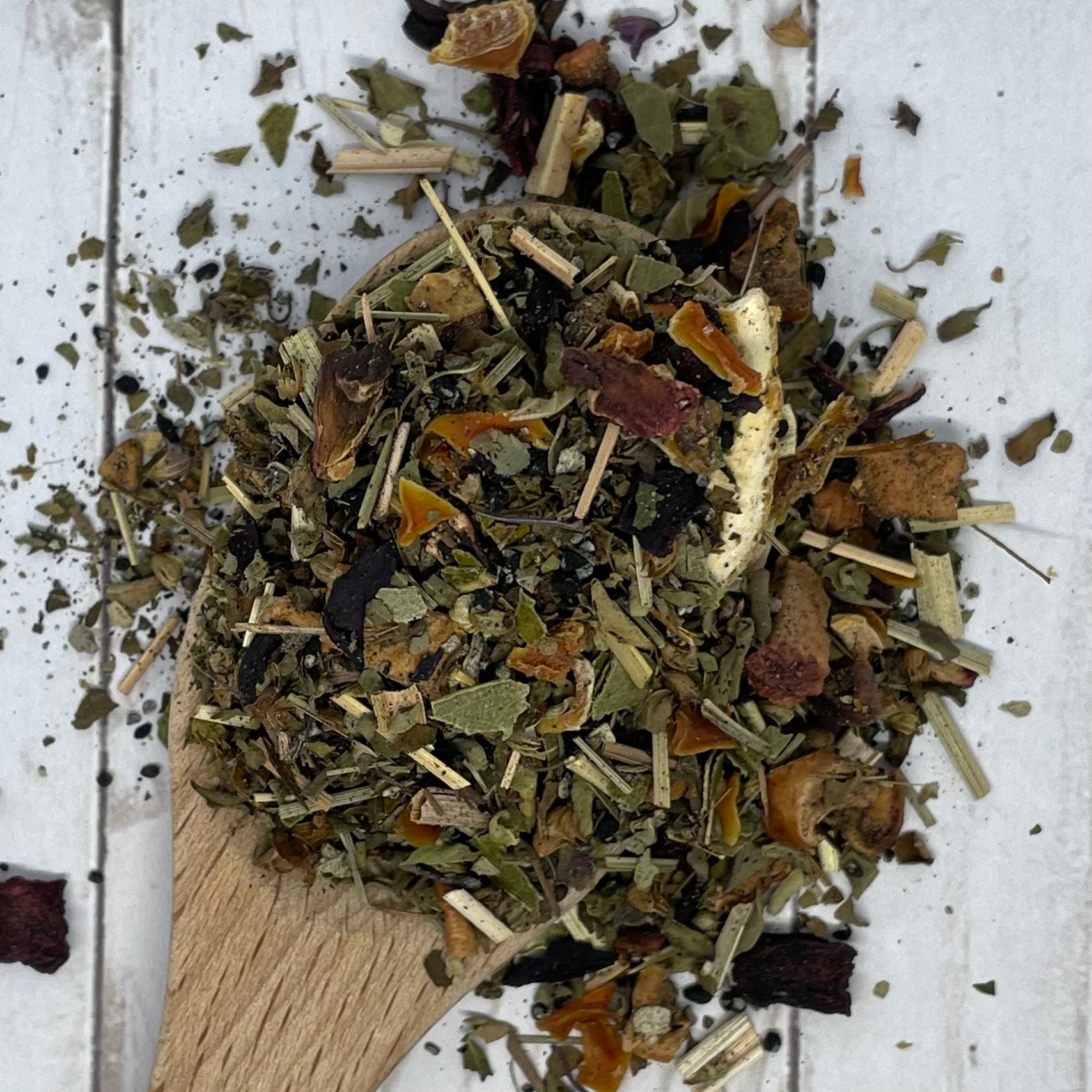 Ingredients: Tulsi, black cumin seed, blackberry leaves, eucalyptus, lemongrass, beetroot, hibiscus, apple, carrot, blood orange